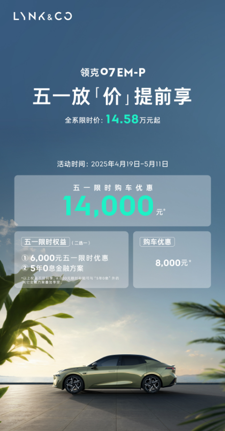 综上而言,如果从外观设计、性能表现与配置体验来看的话,领克 07 EM-P完全可以媲美50万级的BBA 56E。不过如今在限时权益加持下,领克 07 EM-P迎来历史最低价。根据领克官方政策,在2025年4月19日-5月11日购买领克 07 EM-P,全系限时价仅14.58万元起。另外还有限时至高5年8万0息的金融方案,即便是经济实力相对不那么雄厚的年轻人,也能轻松入手。最近有购车需求的小伙伴,建议可以亲自到上海车展现场或是当地门店好好体验一下领克 07 EM-P再做决定,错过真就等一年!